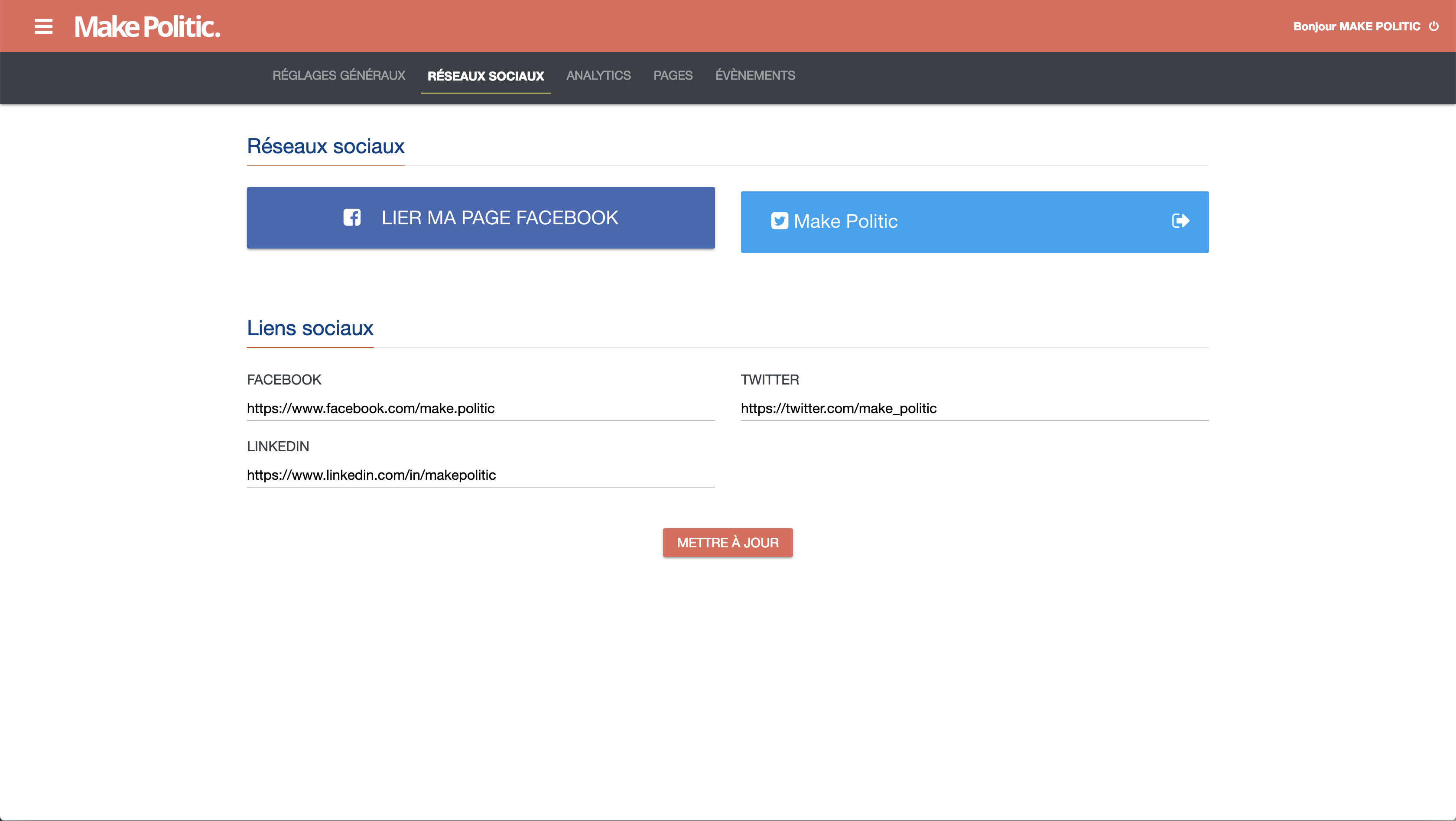 Installez le module médias sociaux sur Make Politic. et publiez automatiquement vos actualités sur vos réseaux sociaux (Facebook et Twitter).